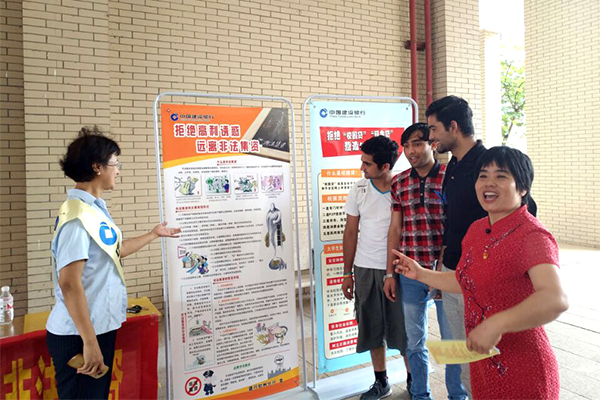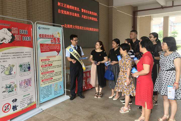 2019年5月28日上午,学校财务处与建行钦州分行在校园内联合开展以“携手筑网·同防共治”为主题的防范非法集资宣传活动。