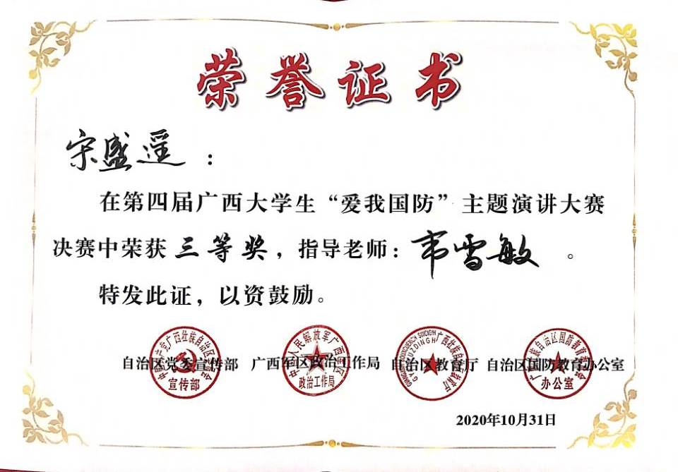 10月31日,全区第四届广西大学生“爱我国防”主题演讲大赛决赛成绩出炉,我校海运学院2017级轮机工程专业宋盛遥同学荣获三等奖的好成绩。