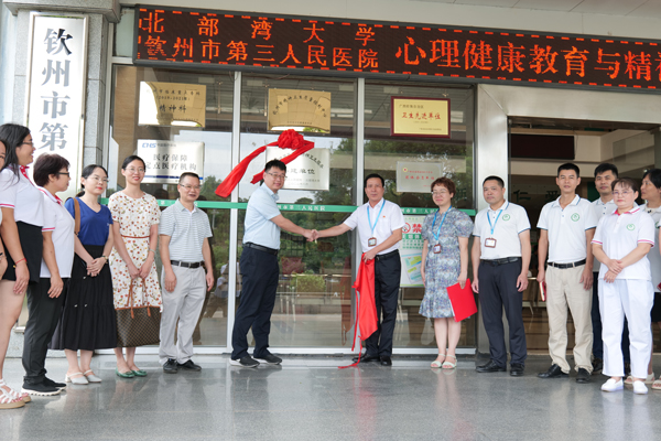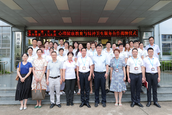 8月28日下午,我校与钦州市第三人民医院(钦州市精神病医院)在该院举行“心理健康教育与精神卫生服务共建单位”签约和揭牌仪式。学校党校办副主任倪文豪,学生工作部(处)副部(处)长劳昌锦,大学生心理健康教育中心专职教师吴正慧、王洁莹,钦州市第三人民医院院长廖有兴及各科室负责人参加仪式。