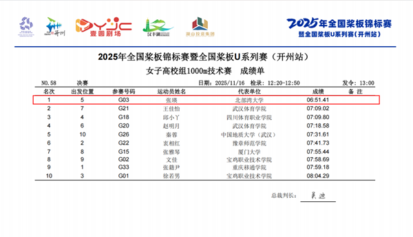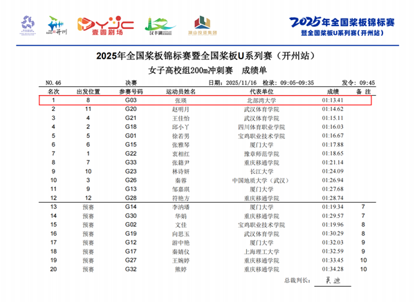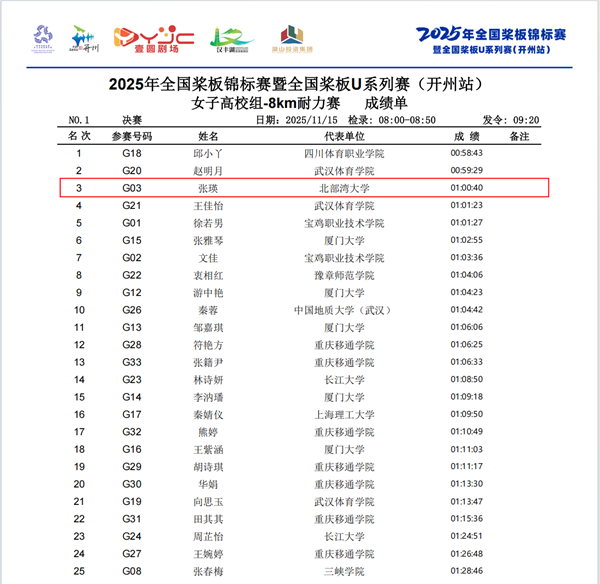 11月15日至16日,2025年全国桨板锦标赛暨全国桨板U系列赛(开州站)在重庆开州汉丰湖举行。本次赛事为国内桨板运动最高级别比赛,共吸引来自全国20个省市的93支队伍、1236名选手参赛。我校桨板队表现出色,体育学院体教本231班学生张瑛从来自全国高校的一众强手中脱颖而出,在高校组女子项目中勇夺双冠,实现了历史性突破。