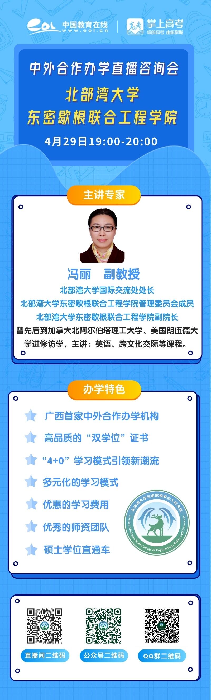为帮助各位考生和家长更全面地了解北部湾大学东密歇根联合工程学院中外合作办学情况,解决大家关注的热点问题,北部湾大学东密歇根联合工程学院将携手中国教育在线·掌上高考于4月29日晚19:00—20:00举办“2022年中外合作办学网络直播咨询会”活动,届时,该院副院长冯丽将通过网络直播的方式详细解读学院的基本情况、招生政策、特色人才培养优势等内容,并在线与考生及家长进行互动交流、答疑解惑。
