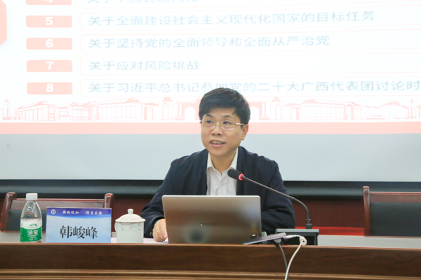 韩峻峰从“党的二十大的主题、主要成果,过去5年的工作和新时代10年的伟大变革,马克思主义中国化时代化,中国式现代化,全面建设社会主义现代化国家的目标任务,坚持党的全面领导和全面从严治党,应对风险挑战,习近平总书记参加党的二十大广西代表团讨论时的重要讲话精神等八个方面,对党的二十大精神进行了全面系统地宣讲解读。