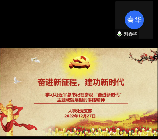 12月27日下午,人事处党支部在线上召开党的二十大精神专题学习会。会议由党支部书记朱芳阳主持,分别由朱芳阳和刘春华同志领学,全体党员同志参加学习。