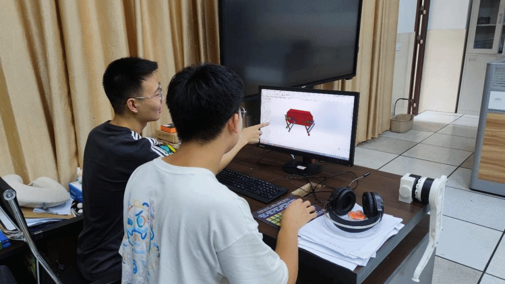机械方向的2021级硕士何从伟和王甘霖同学使用SolidWorks软件绘制四足机器人的模型,并进行修改和优化工作,这样的事情对于机械专业的他们来说几乎每天都在发生,这个小小的工作台将是一个优秀作品的诞生基地。