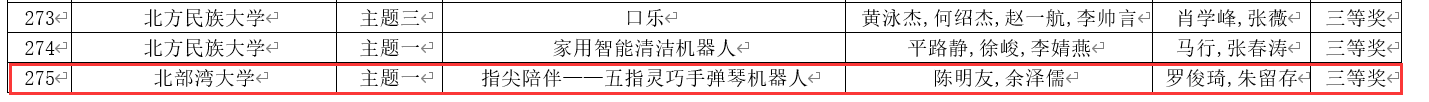 该项目是我校唯一进入区赛项目。在朱留存老师和罗俊琦老师的指导下,我院项目《指尖陪伴——五指灵巧手弹琴机器人》经过技术攻关,持续改进,在本次比赛中取得省级三等奖的成绩。