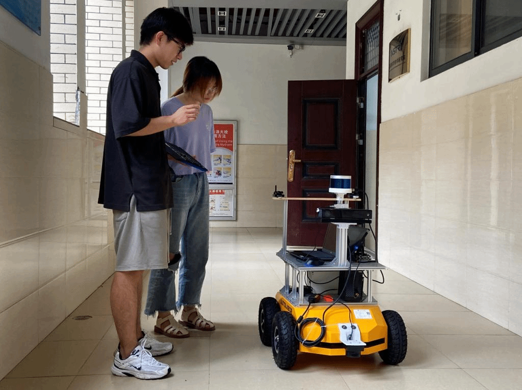 不问暑假留在实验室是否单调,在他们眼里,科研的世界也同样缤纷。在无人系统实验室里20级机械研究生武宏伟、扬州大学20级电子信息研究生程敬迪正在对机器人的多传感器融合SLAM技术做研究。机器人搭载了激光雷达、深度相机、IMU、定位标签、GPS等传感器。在未知环境中从一个未知位置开始移动,在移动过程中根据位置估计和地图进行自身定位,同时在自身定位的基础上建造增量式地图,实现机器人的自主定位和导航。他们说SLAM的前景很广阔可以应用于机器人、自动驾驶等领域,希望可以通过自己的专业技能改变人们的生活。