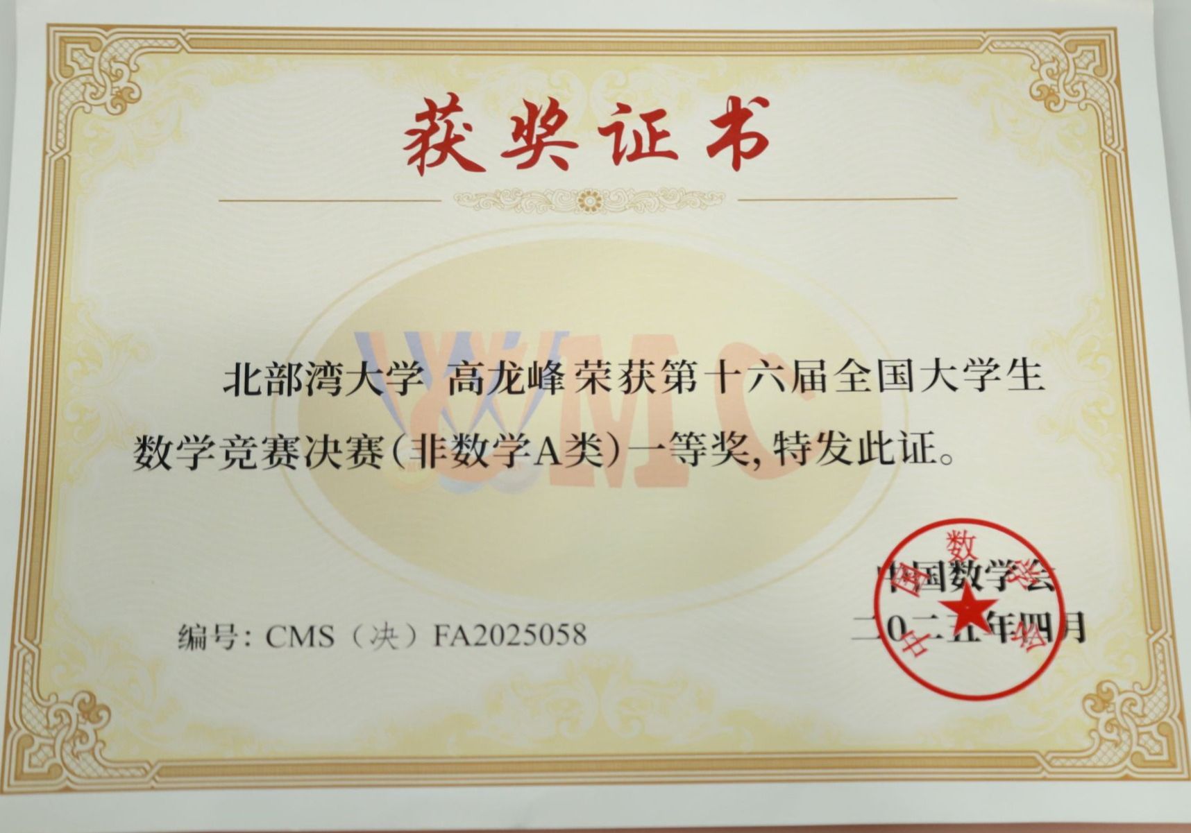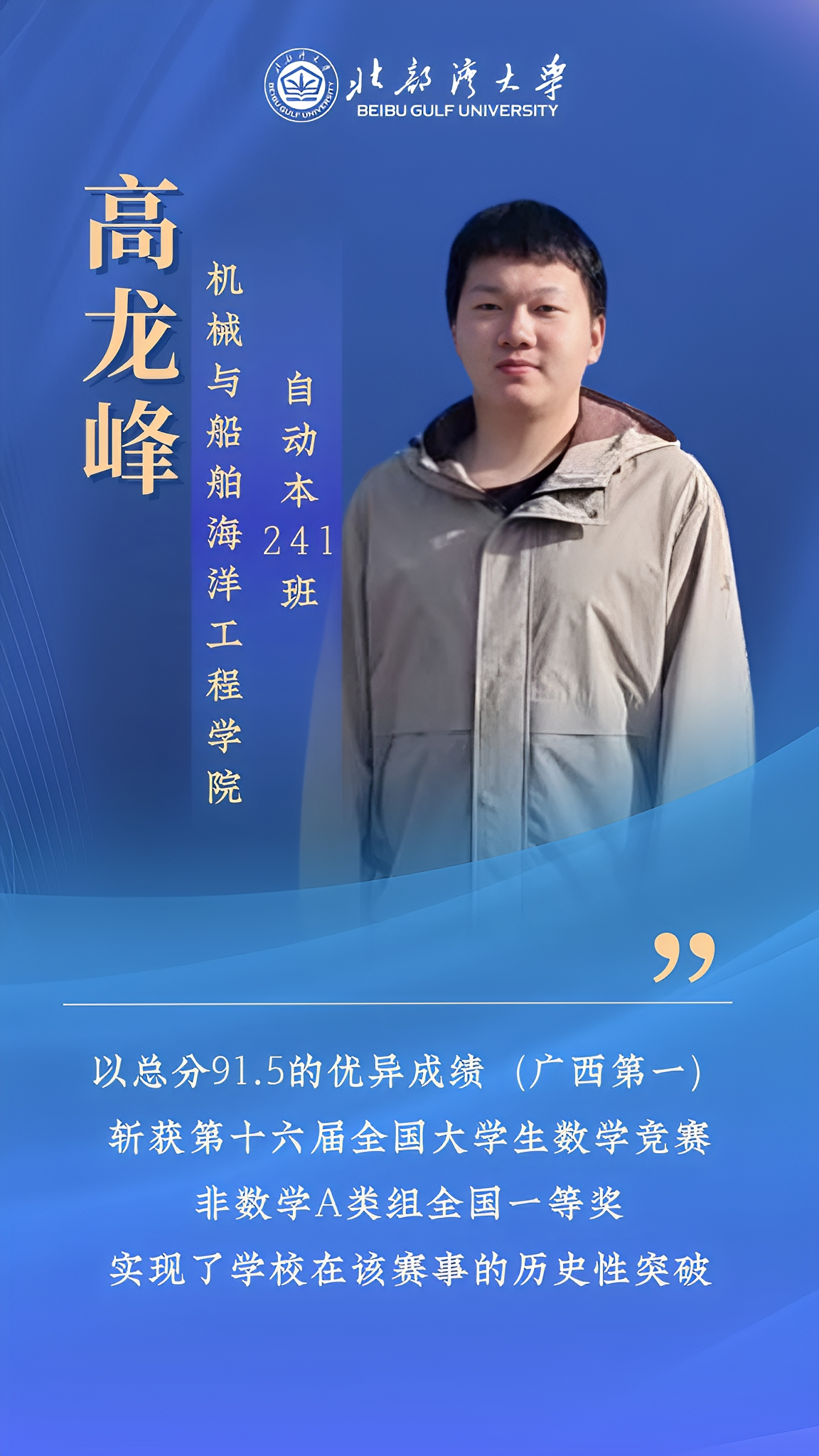 2025年4月,喜报从浙江师范大学举办的第十六届全国大学生数学竞赛决赛现场传来,我校机械与船舶海洋工程学院自动化专业241班高龙峰同学以总分广西第一的优异成绩斩获非数学A类组全国一等奖。这刷新了我校在该项赛事中的最佳纪录,让这位数学爱好者走进了我们的视野。