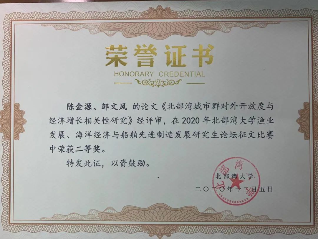 论文获2020年北部湾大学渔业发展、海洋经济与船舶先进制造发展研究生论坛征文比赛二等奖
