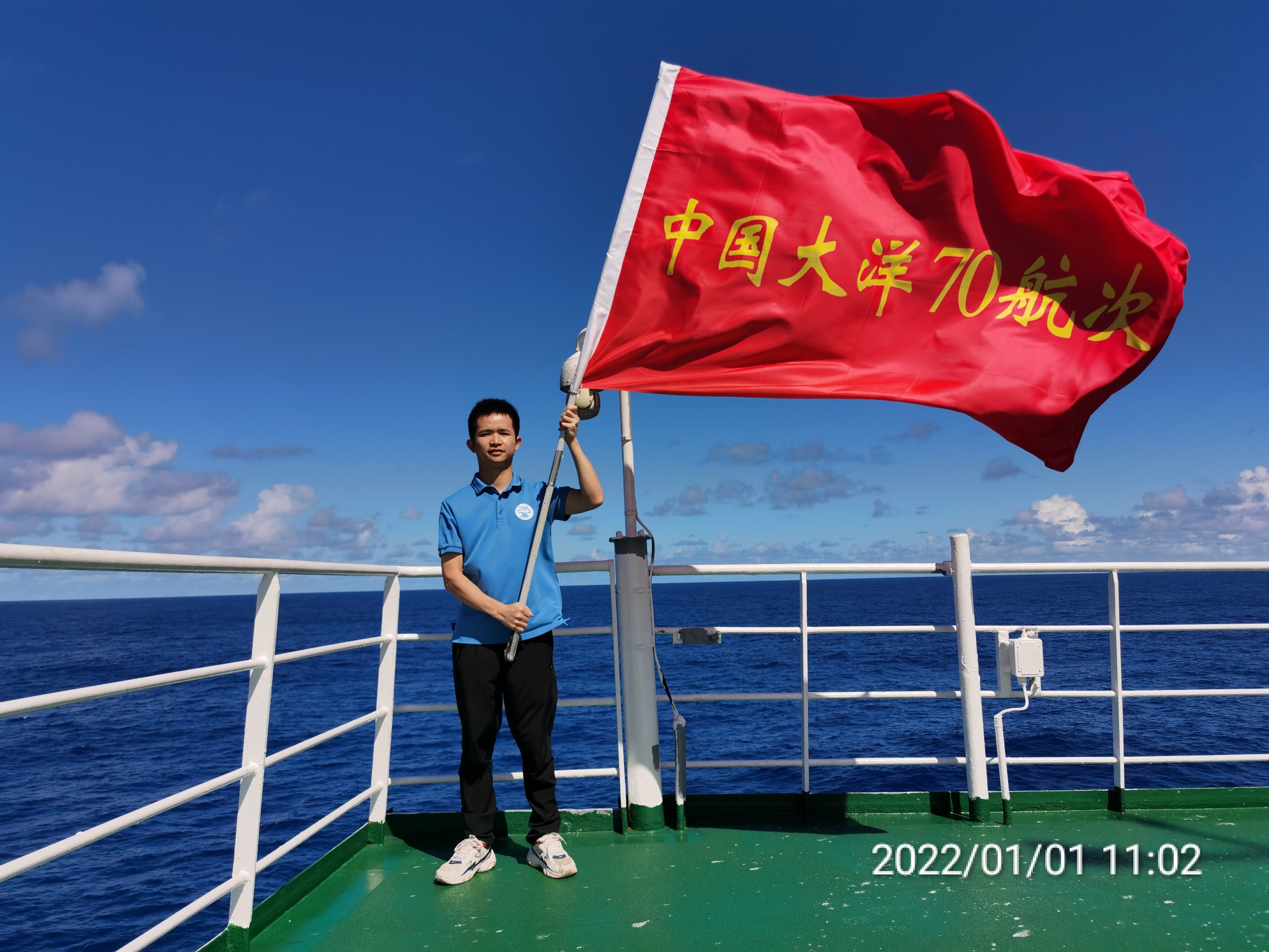 陆旋在攻读硕博期间参加中国大洋70航次,在太平洋上留影