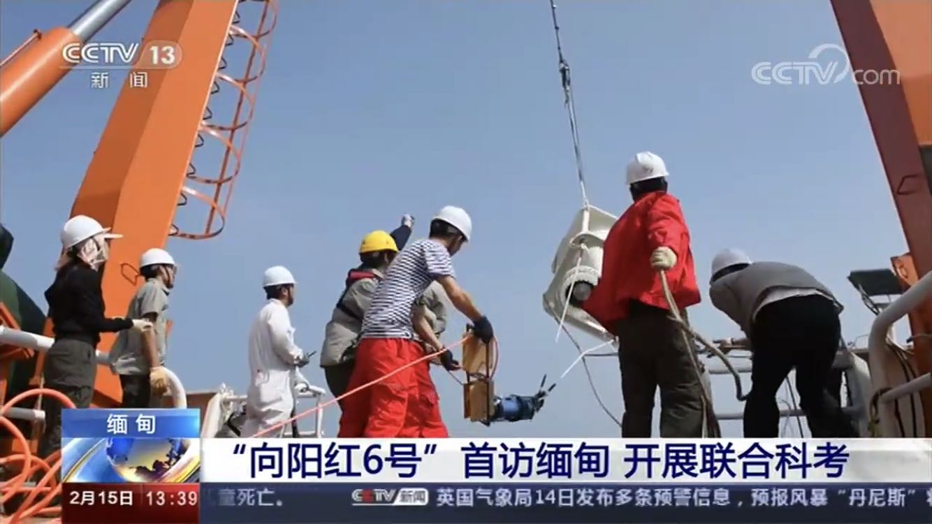 陆旋(图中身着蓝色条纹衫者)在攻读硕博期间参加的航次访问缅甸,开展科考工作,被中央电视台报道