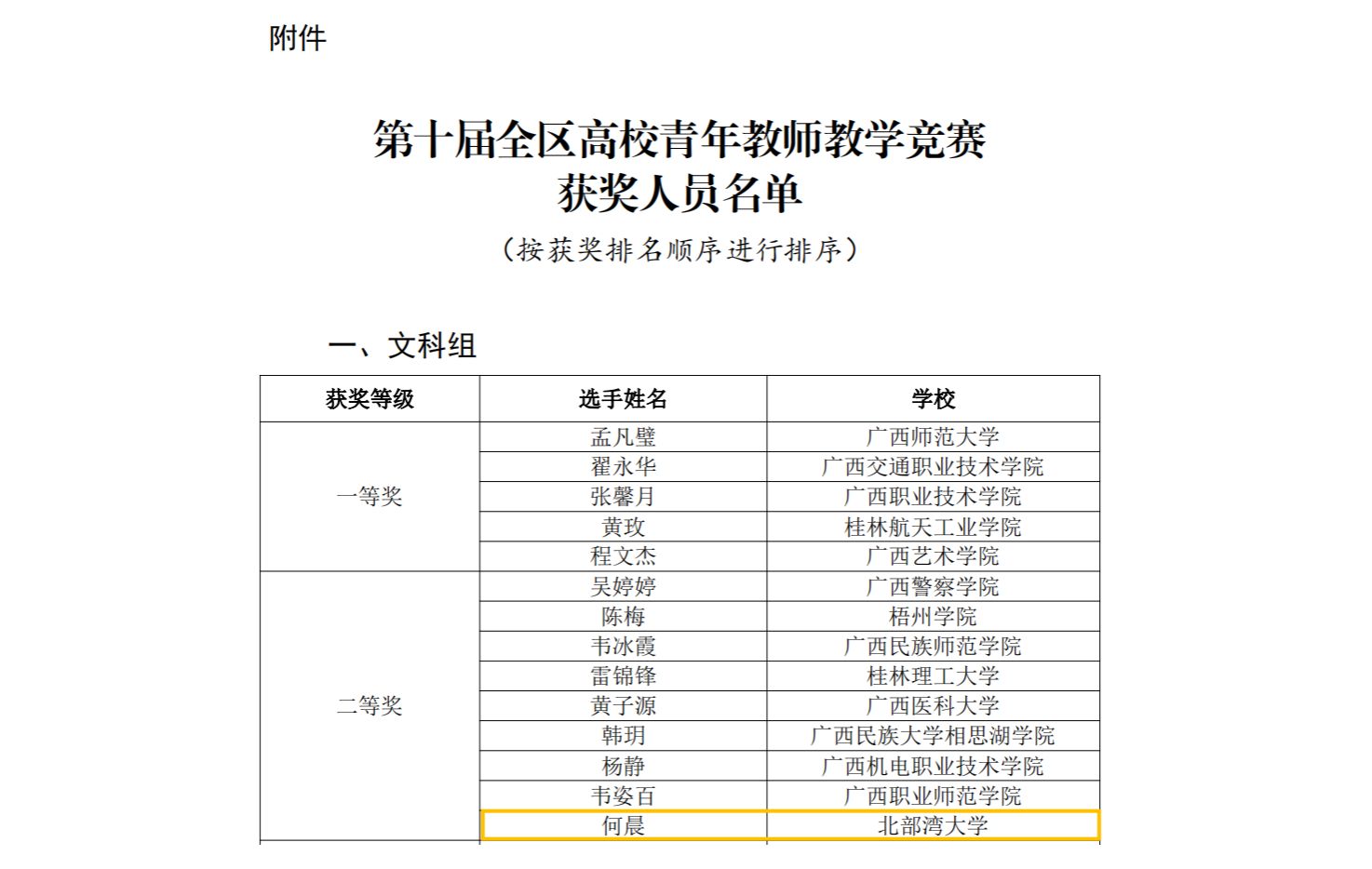 近日,第十届全区高校青年教师教学竞赛获奖名单正式公布,我校共有四名教师获奖。其中人文学院何晨老师荣获文科组二等奖,理学院欧玉芹老师荣获理科组三等奖,建筑工程学院张蕾蕾老师荣获工科组三等奖,马克思主义学院颜文娟老师荣获思政组三等奖。
