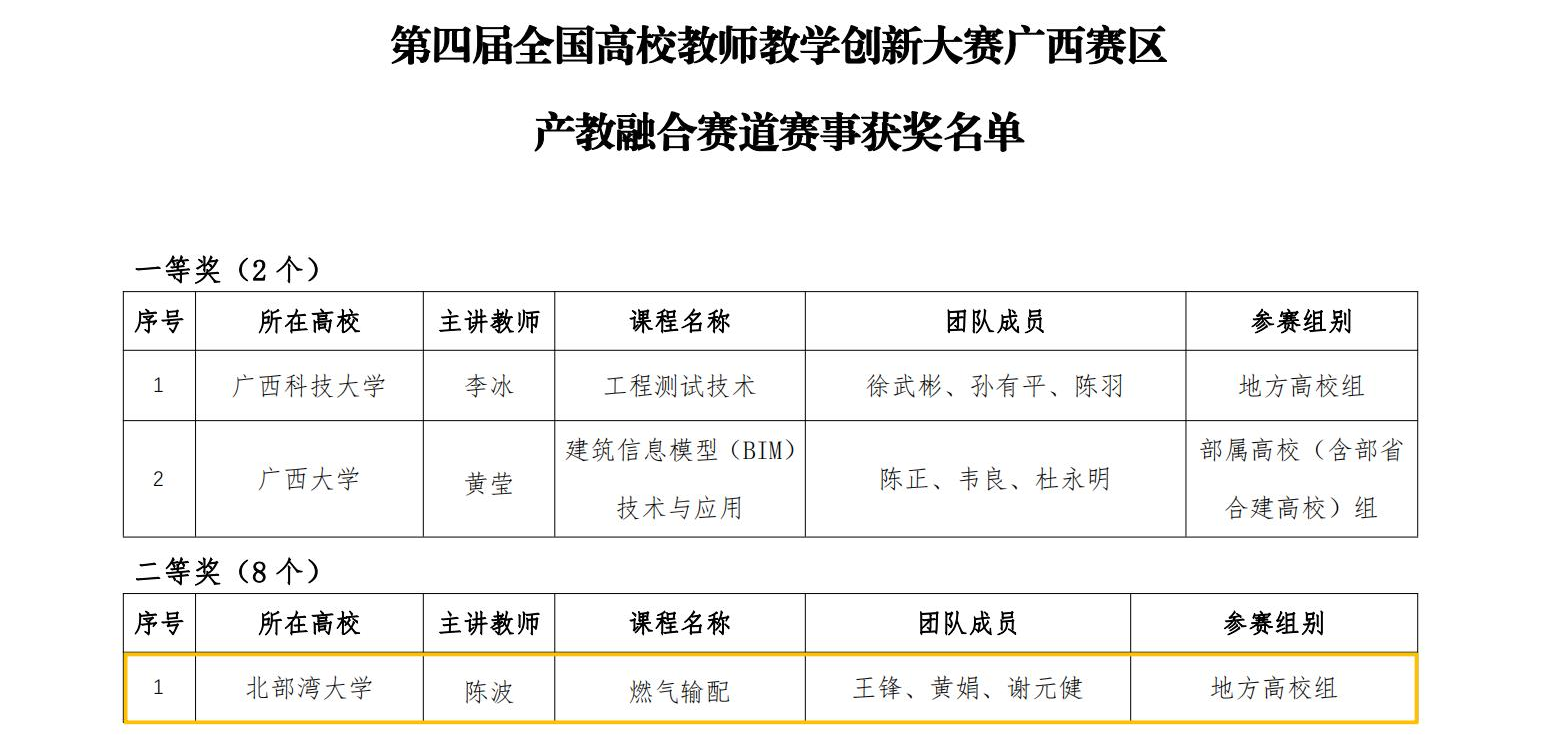 近日,第四届全国高校教师教学创新大赛广西赛区比赛产教融合赛道获奖名单正式公布,我校石油与化工学院陈波老师获二等奖,地方高校组第二名的佳绩。