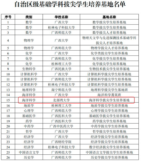 近日,自治区教育厅公布了自治区级基础学科拔尖学生培养基地名单,我校“海洋科学拔尖学生培养基地”入选其中,该基地也是北部湾大学首个自治区级基础学科拔尖学生培养基地。