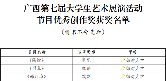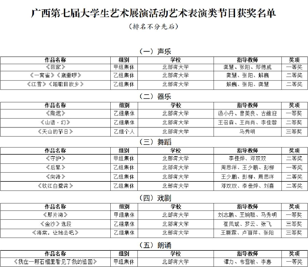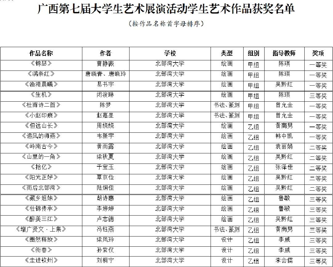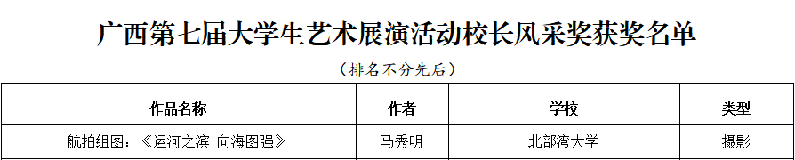 4月15日,广西第七届大学生艺术展演活动获奖名单公布,我校获奖项目创历史新高:艺术表演类节目一等奖5个、二等奖6个、三等奖3个,节目优秀创作奖3个;艺术作品类一等奖7件、二等奖5件、三等奖8件;校长书画摄影作品风采奖1件。其中戏剧节目《那片海》、摄影航拍组图《运河之滨 向海图强》入围全国大学生艺术展演。
