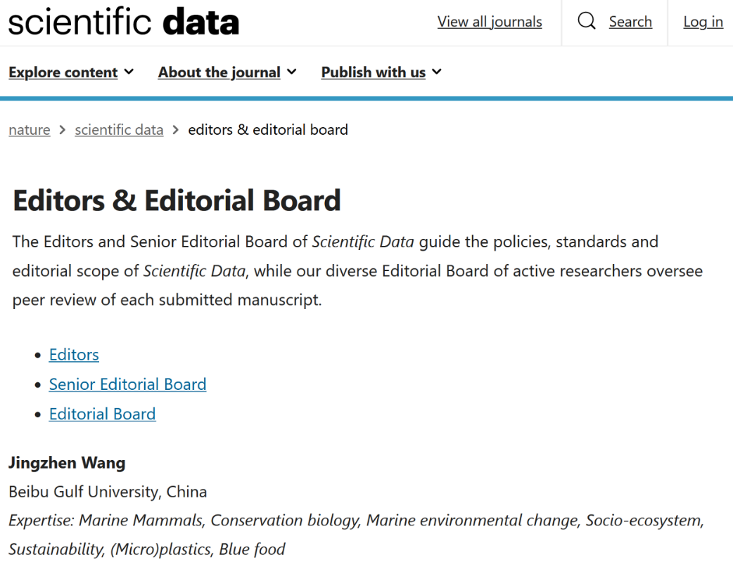 近日,我校海洋学院王京真教授,应Nature数据期刊Scientific Data邀请,担任该刊编委(Editorial Board)。
